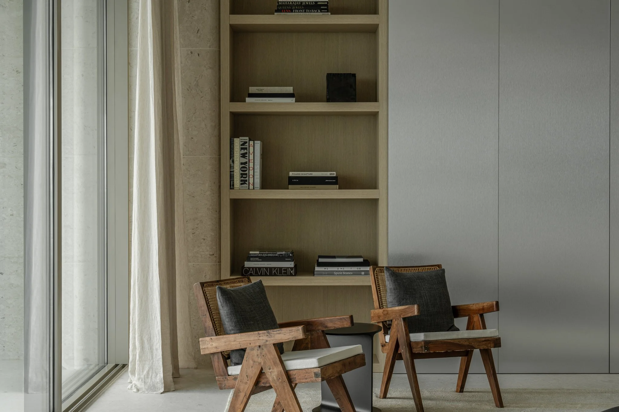 The interiors are defined by ease and precision. Custom Belgian millwork runs throughout, grounding the apartment in craftsmanship and restraint. A palette of bleached oak, soft plaster, natural stone, and brushed stainless steel lends warmth and clarity, allowing light and views to shape the mood of each space.